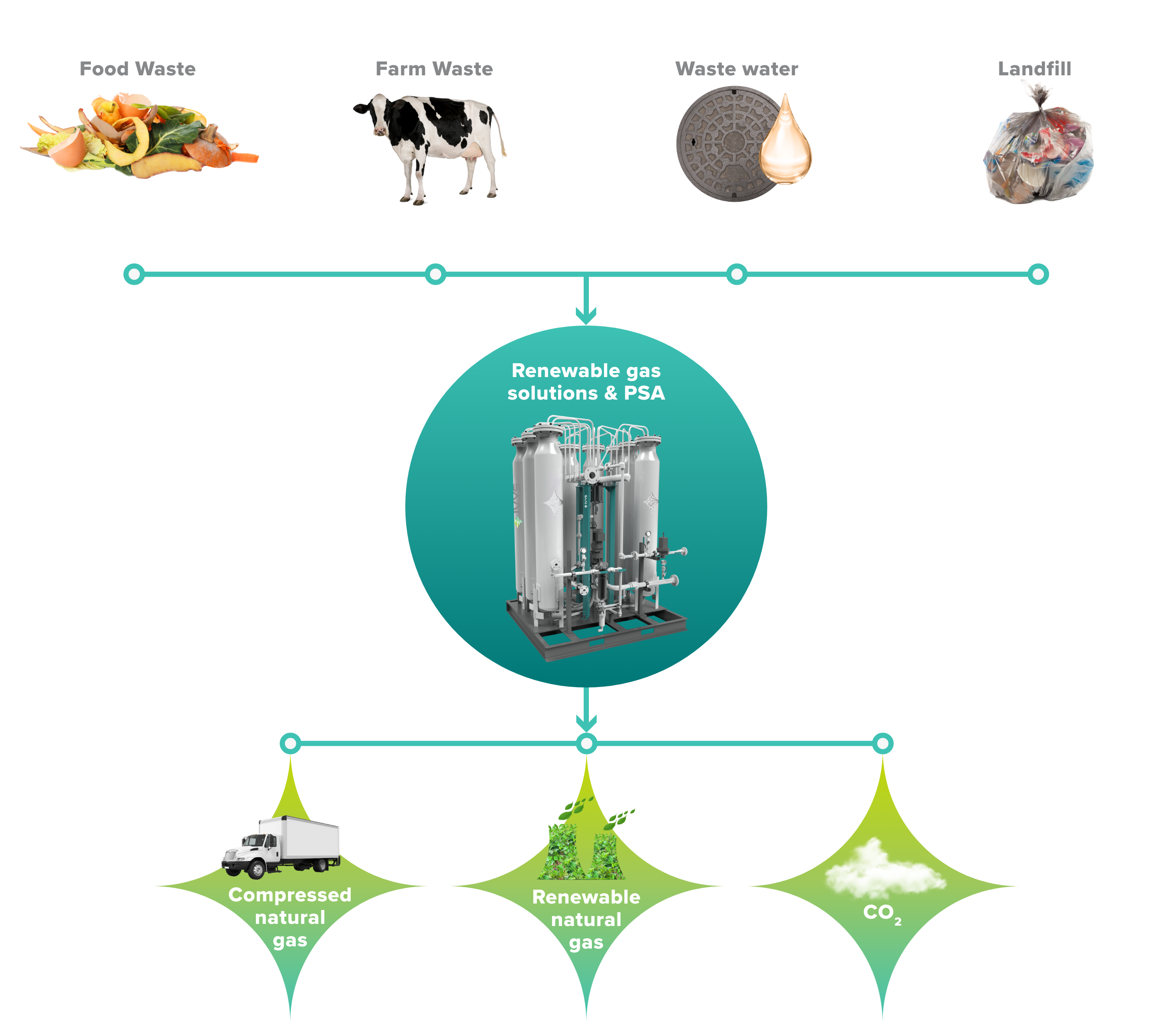 A cut above competing biogas upgrading solutions. Our biogas upgrading’s core technology uses our proprietary PSA system, one of the most compact, economical, and reliable gas purification systems available today. The PSA’s unique fast-cycle rotary valve technology and advanced adsorbents is optimally designed to maximize methane recovery, even when levels fluctuate. Changes in feed impurity are automatically adjusted for continuous upgraded biogas production while consuming significantly less energy.